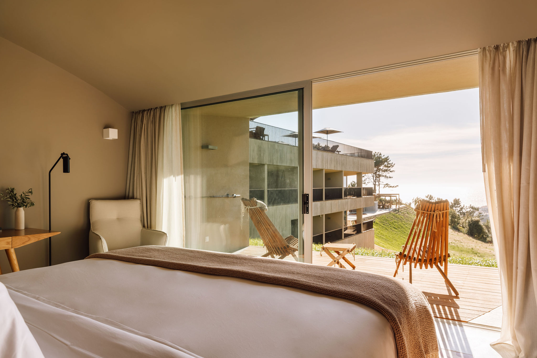 The interior design project was conceived from nature, a unique space, with textures of land and sea. The use of natural materials and organic forms, immersed in tranquillity. The colours are details, on a neutral base in shades of sand, and notes of terracotta, blues, water green and mustard.